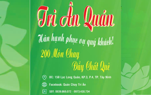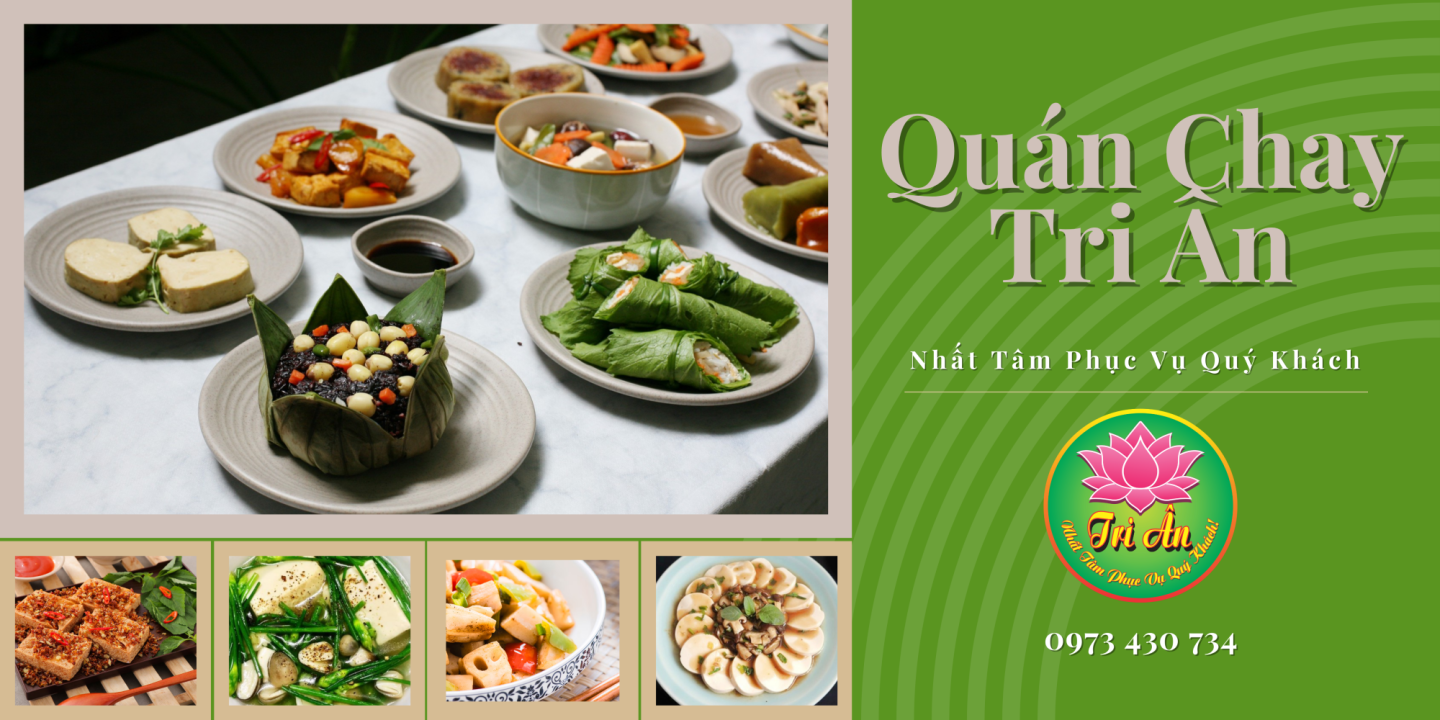 Phương Châm Của Quân Sức khỏe là vàng. Cuộc sống hiện nay chúng ta thấy nhiều chứng bệnh như: Cao huyết áp, bệnh tim mạch, ung thư,... Có tỷ lệ cao do các món ăn chế biến từ thịt so với những món ăn từ rau củ và hoa quả... Vì thế, Lĩnh vực ăn uống hiện nay là một trong những vấn nạn mà mọi người phải Trăn trở, lo lắng rằng: Nên ăn gì, uống gì...??? Để không ảnh hưởng đến sức khỏe hay phải chọn những loại thức ăn như thế nào vừa ngon lại bổ dưỡng... Để giải tỏa phần nào những lo âu đó, Tri ân chúng tôi xin phục vụ các món ăn chay được chế biến từ hoa lá, rau củ, quả, hạt, mầm,... Hy vọng sẽ hỗ trợ cho việc ăn chay và mang lại sức khỏe tốt hơn cho quý khách. Đội ngũ quản lý - nhân viên tri ân luôn tận tụy, chu đáo, và hết lòng vì khách. Chúng tôi luôn lắng nghe mọi đóng góp ý kiến phản hồi của quý khách sẽ là kinh nghiệm giúp cho quán chay tri ân chúng tôi ngày càng hoàn thiện hơn, xin hãy gọi: 0973.430.734 - Mong được sự ủng hộ của quý khách Xin tri ân những tấm lòng vàng của quý khách luôn ủng hộ chúng tôi Kính chúc quý khách ngon miệng!